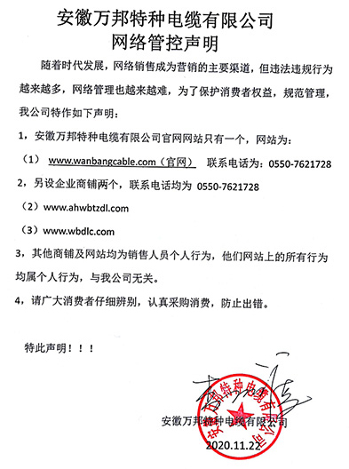 鄭重聲明:安徽萬邦特種電纜有限公司官方網站為:www_wanbangcable_com.zzzzgl.com,除此之外無任何子網站或合作網站,其余均為假冒偽劣。電話:0550-7621728 13485756353 地 址:安徽省天長市滁州高新技術產業開發區經四路29號